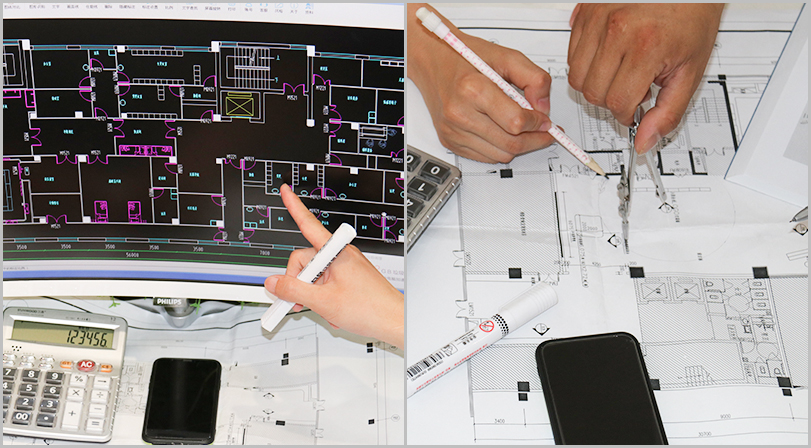 每承接一個工程,公司都會派出經(jīng)驗豐富的技術團隊上門勘察、實地測量,提供工程設計方案。測量各個房間尺寸及造型情況,做好記錄,做到心中有數(shù)。